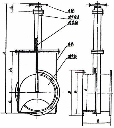 1.1、本阀由外壳、调节板、调节轴、轴承座盖等零件组成一体,依靠受轮带动调动调节轴升降,从而使调节板对流体流量的调节。